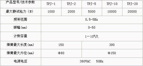 產(chǎn)品概述: TPJ系列機械式彈簧疲勞試驗機主要應用于拉伸、壓縮螺旋彈簧的疲勞壽命試驗 功能特點: 振幅、頻率可調;振動次數(shù)及頻率數(shù)字顯示; 預置試驗次數(shù)自動停機;可做單對或多對彈簧的試驗機; 操作簡單、運行可靠。 技術參數(shù):